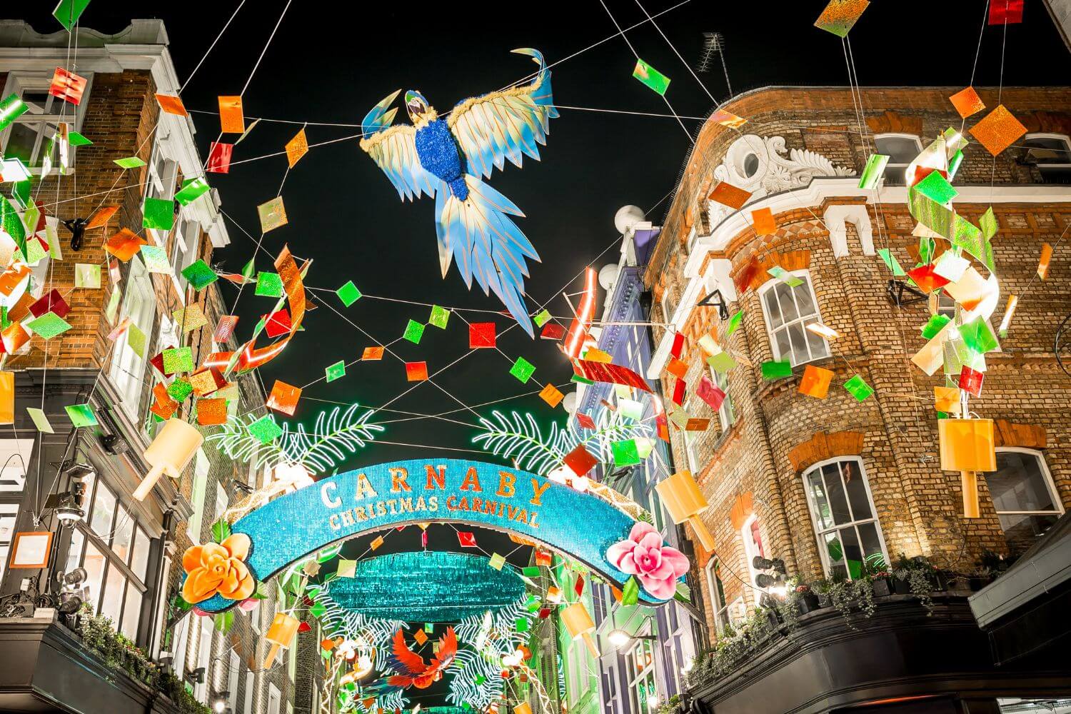 Carnaby Street always brings the playful energy. For 2025 the display returns on Thursday 6 November under the title ‘All is Bright’, a reprise of last year’s sculptural installation, with multi-metre forms and tens of thousands of energy-efficient LEDs floating above the lane.